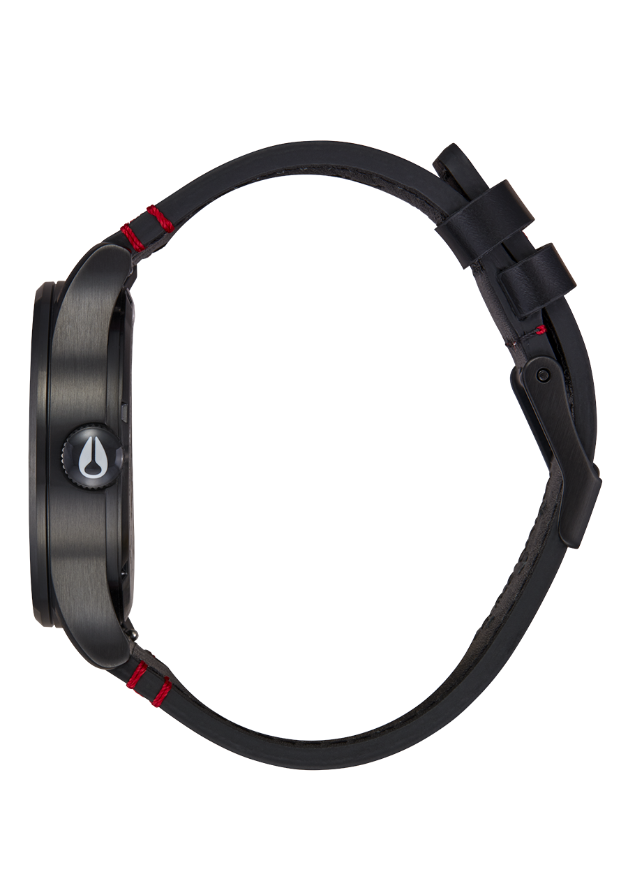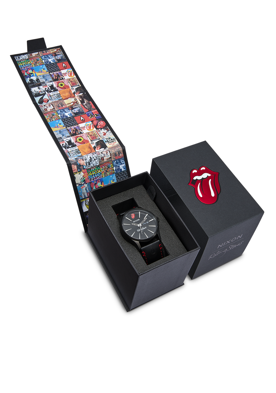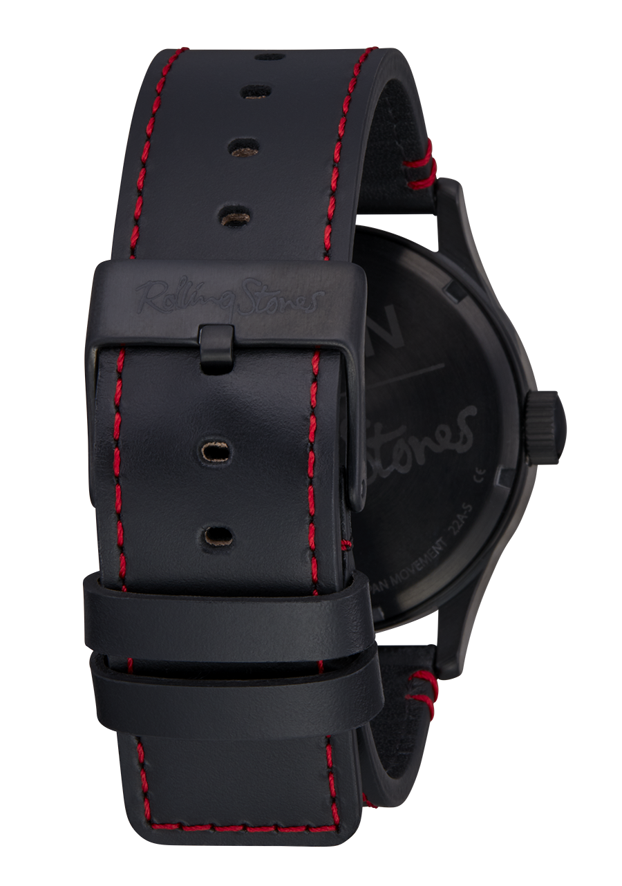 The elegant Sentry Leather in a midnight jam style. Think jazz club meets early bluesy rock. The Rolling Stones signature and contrasting Tongue make the face detail pop without overplaying. Meanwhile, with the solid stainless-steel case, hardened mineral crystal, and waterproof rating of 10 ATM / 100m water rating, you don't have to worry about it not being able to live up to its image.